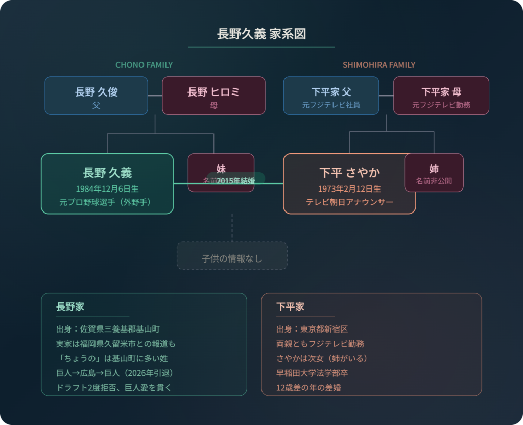 。妹がいる一般的な4人家族から、プロ野球選手という華やかな世界へ。妻・下平さやかさんとの12歳差夫婦生活は、手術時の献身サポートが結婚の決め手となった「長い絆」が基盤で、子供を持たない選択を夫婦で大切にしている静かな円満ぶりが一次レベルで感じられます。
