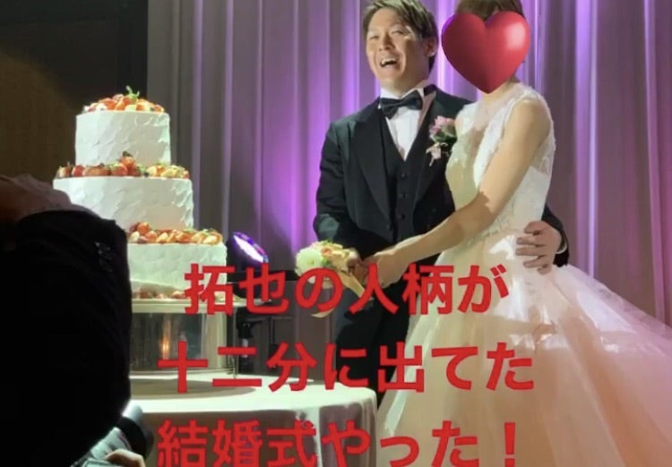 プライバシーを尊重した対応ですね。ただ、結婚式(2019年頃)の様子が一部関係者のInstagramやファンブログに残っていて、以下のような写真があります。ただ、妻の顔部分はハートで隠されていますね。