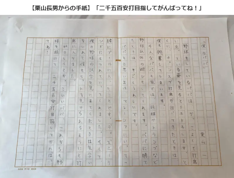 2021年9月5日掲載の日刊スポーツ「【栗山長男からの手紙】「二千五百安打目指してがんばってね!」」では、2000安打達成時に叙気の画像のように長男・一君の手紙が全文公開されました。