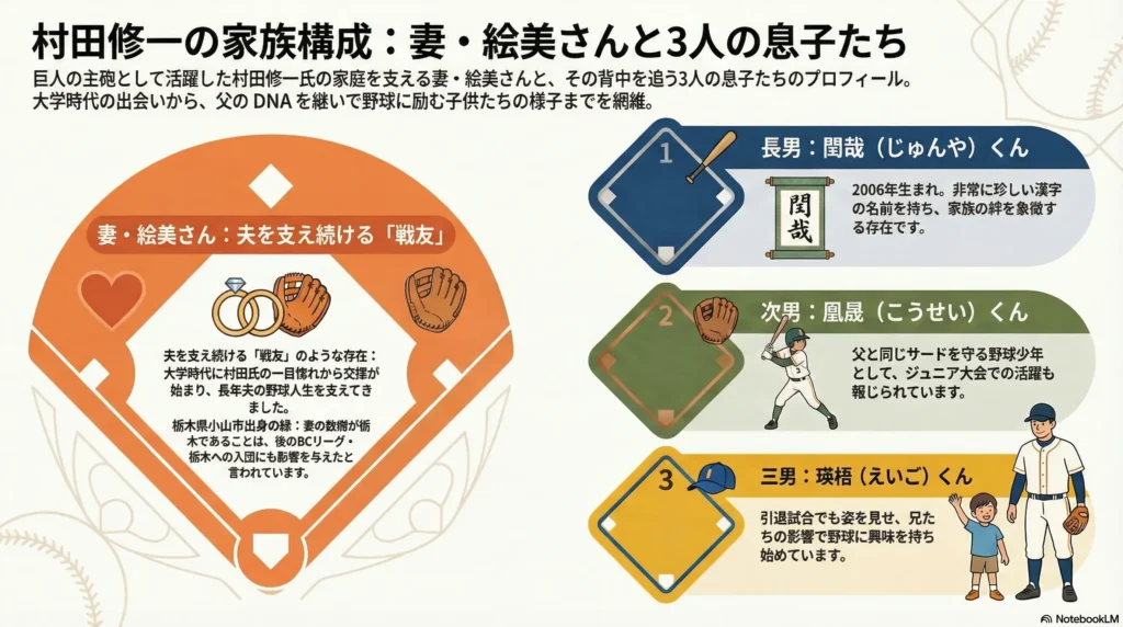 村田修一さんの家族は、妻と3人の息子さんの5人家族です。プロ野球選手としての現役時代からコーチ業に至るまで、この家族の存在が彼の大きな支えとなってきました。