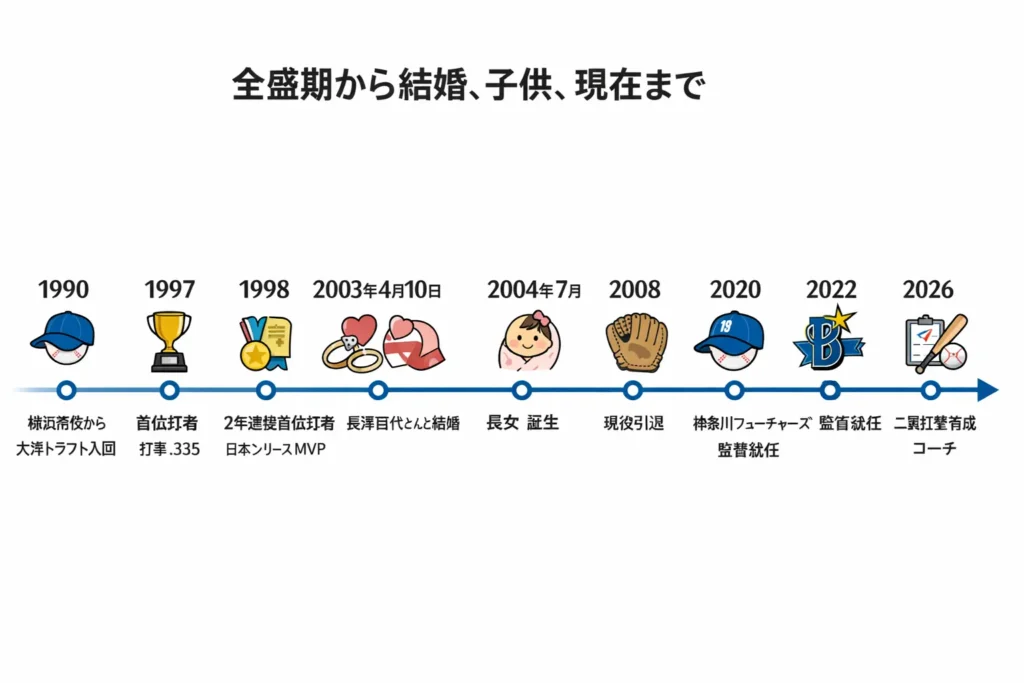 - 主な実績:首位打者2回(1997年、1998年)、日本シリーズMVP(1998年)