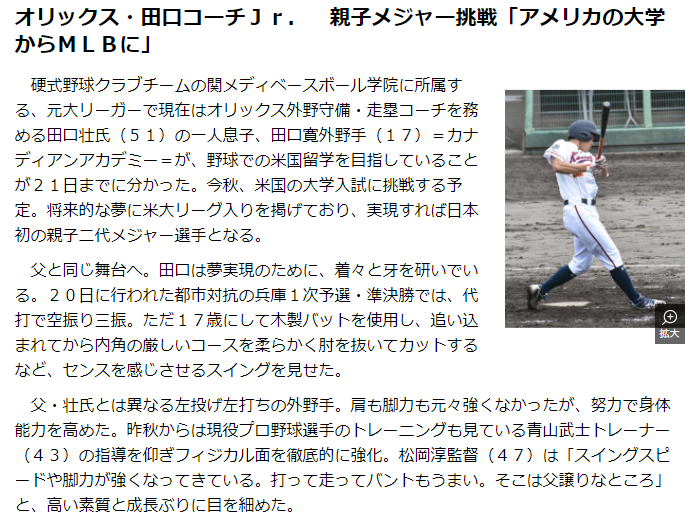 最近(2024~2025年)もX(旧Twitter)やブログで「田口壮さんの息子・カン・タグチが大学編入」「親子メジャー挑戦」と話題になり、検索エンジンが古い記事も拾って残っています。